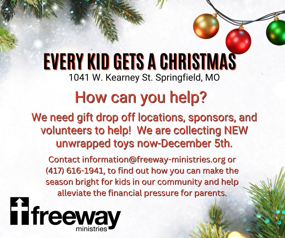Now through December 9th, we will be collecting NEW and UNOPENED gifts for ages birth – 18. We will have a list of drop off locations at www.freeway-ministries.org If you have a business, we would love to place a collection container at you location. We also are accepting financial gifts or gift cards. If you are interested in helping, please contact us at information@freeway-ministries.org or by calling (417) 616-1941.